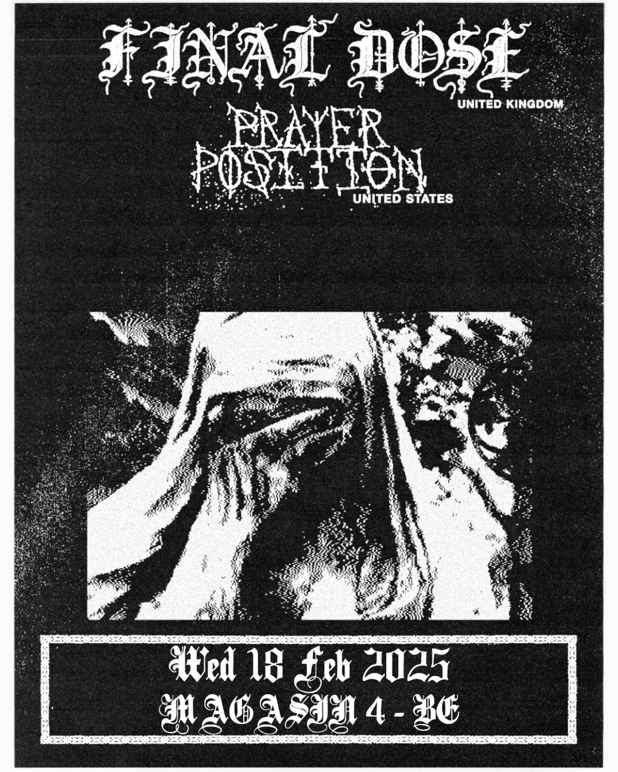 Prayer Position is a harsh, blackened punk band from Boston, MA. Their sound is rooted in sonic extremes, blending elements of primitive black metal, raw punk, and power electronics. Their live performances are marked by a feral cacophony in near darkness, with violently rattling chains, piercing noise, and an atmosphere of chaos and threat.